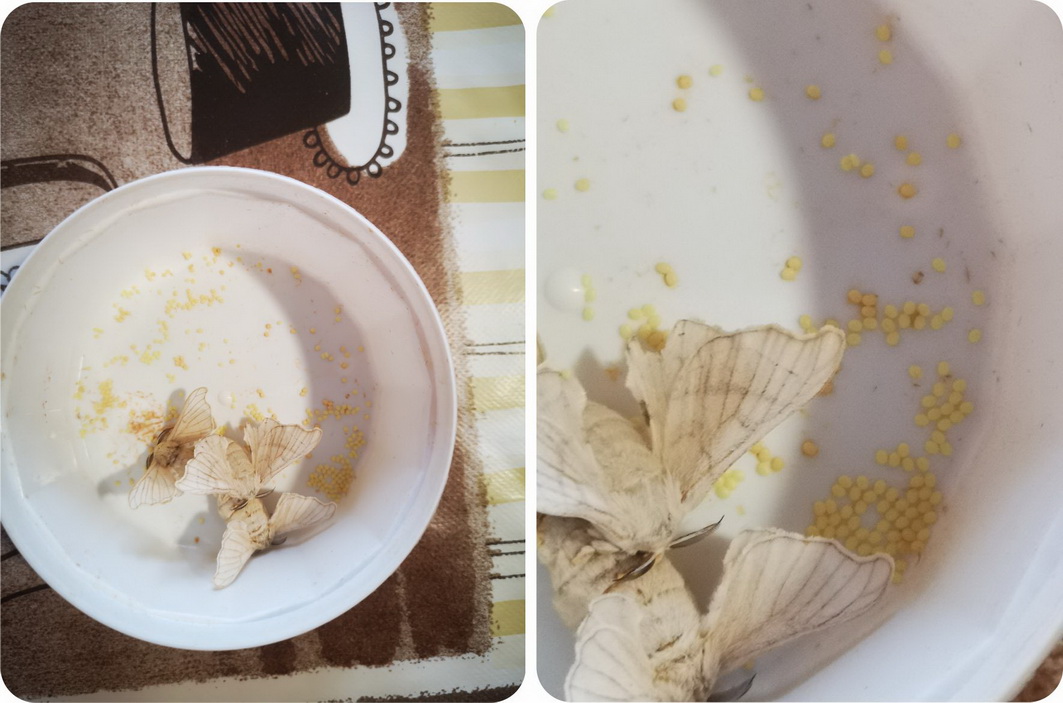 Eravamo euforici di poter essere stati testimoni di questa meravigliosa trasformazione. Appena nate le falene si sono accoppiate, e dopo neanche un giorno hanno iniziato a deporre le uova, tanti piccole sfere tonde bianche.