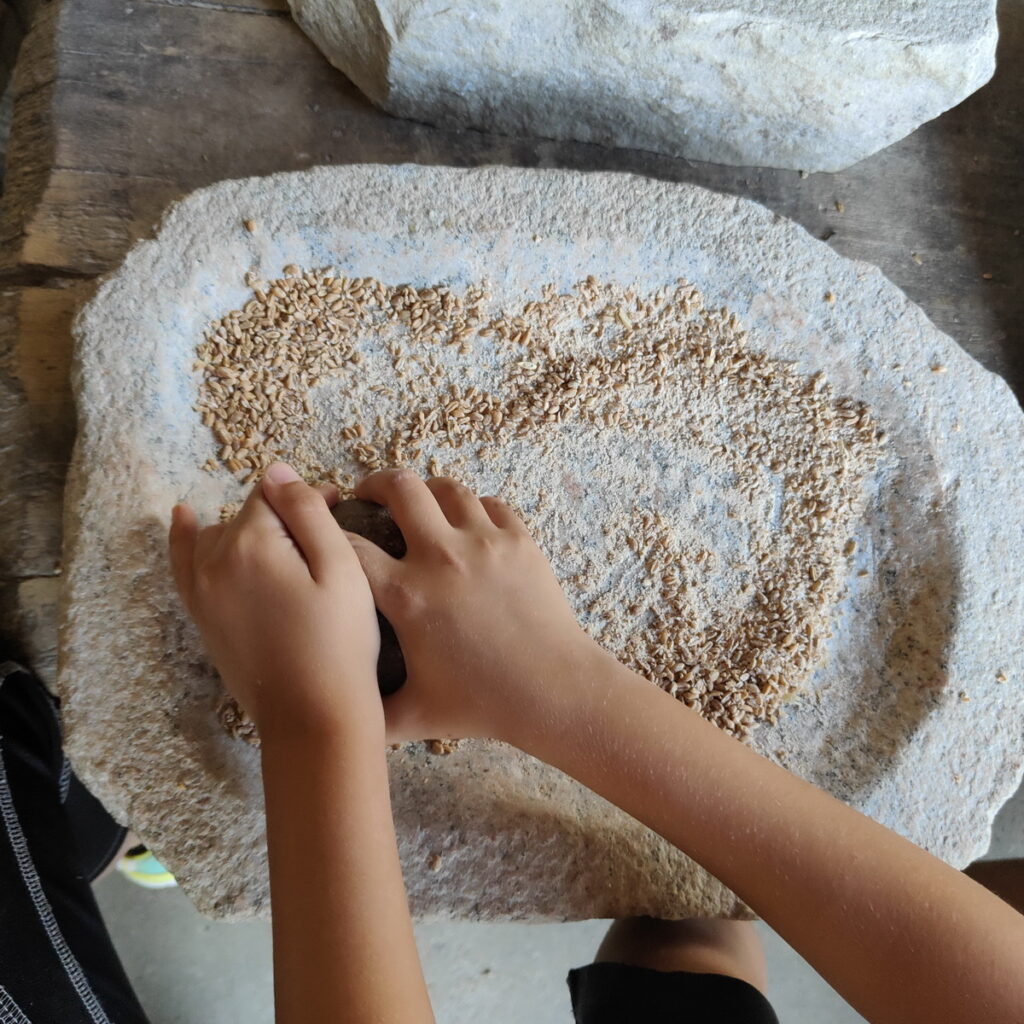 Altrettanto incredibile è stato potersi preparare la merenda partendo dalla macinatura del grano con macine di pietra a mano. Tutti noi ci siamo cimentati in questa attività che, in tutta sincerità, credevamo più semplice e meno faticosa! E’ decisamente un’esperienza che porteremo a lungo con noi e da cui sono certa i ragazzi hanno appreso lezioni importanti.