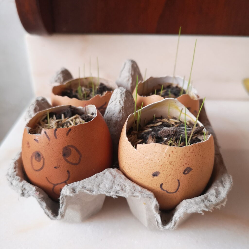 Abbiamo coltivato semi anche per far sorridere i nostri amici, i piccoli semini di erba infatti crescono veloce, così in men che non si dica abbiamo iniziato a creare divertenti capelli a personaggi buffi.