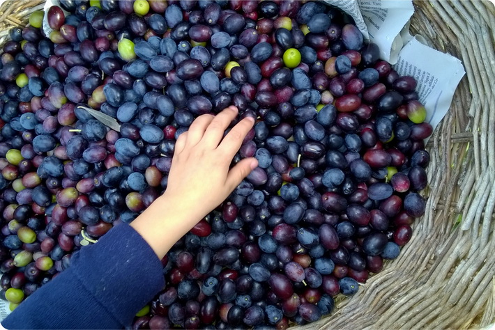 Così ogni anno, cerco di proporre un’attività agricola adatta a ogni stagione. L’anno scorso abbiamo raccolto l’uva con i nostri amici e l’abbiamo pigiata con i piedi in un grande tino, quest’anno abbiamo deciso invece di fare insieme la raccolta le olive, e seguire il processo di trasformazione dall’oliva all’olio.
