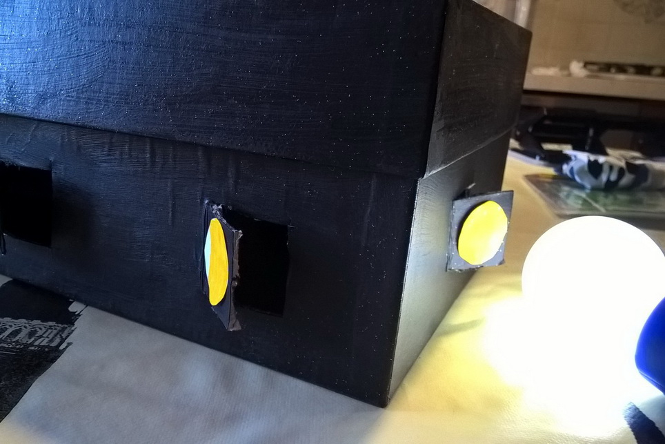 Una volta asciutta la vernice, abbiamo incollato la pallina al centro della scatola e ritagliato lungo i fianchi della scatola delle finestre richiudibili della misura di cm 2×2. In totale le finestre da ritagliare sono nove, tre sui lati più lunghi, una su quelli più corti.