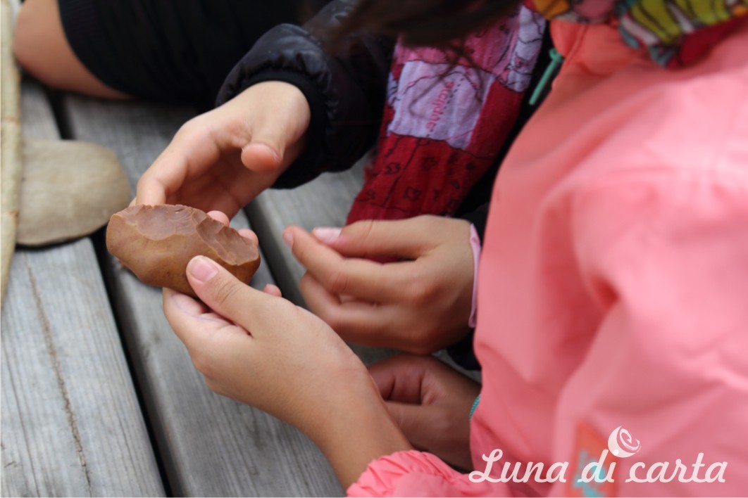 I bambini sono radunati intorno alla nostra guida che come prima cosa ci mostra la selce e l’ossidiana come strumenti di taglio di precisione. I bambini sono affascinati, noi adulti siamo senza parole, non è possibile aver studiato la preistoria tante volte e non aver mai, dico mai aver toccato un’ascia di selce. Poi vogliamo parlare dell’ossidiana? L’ossidiana è di origine vulcanica, il suo taglio è preciso e netto…è assolutamente da provare!