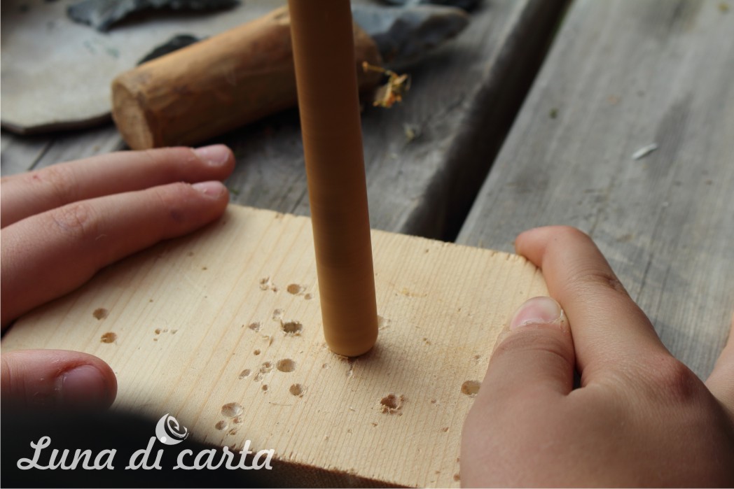 Poi finalmente il fuoco. Ascoltiamo la spiegazione sulle varie tecniche per dare vita al fuoco,ma il momento più entusiasmante è quando ognuno può provare. Vari tentativi timidi e maldestri finchè non appare la fiamma, e lì la meraviglia, lo stupore di questa piccola grande conquista che spero i bambini porteranno a lungo con sè!