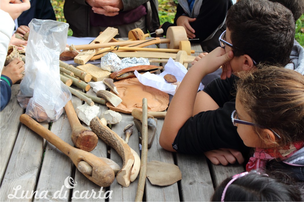 Non credevo fosse possibile replicare in natura tali tipi di attività con i bambini, poi il sig. Luca Manieri ci ha proposto un laboratorio davvero “preistorico”, avremmo non solo accesso il fuoco con varie tecniche, ma avremmo anche potuto assistere alla scheggiatura della selce, alla levigatura con la pietra e alla lavorazione del corno e del legno. Oltre questo avremmo potuto toccare vari strumenti come il raschiatoio, il bulino, perforatori e il trapano a volano o ad arco, tutti strumenti che l’uomo utilizzava agli albori della sua storia e che oggi ovviamente non vediamo più.