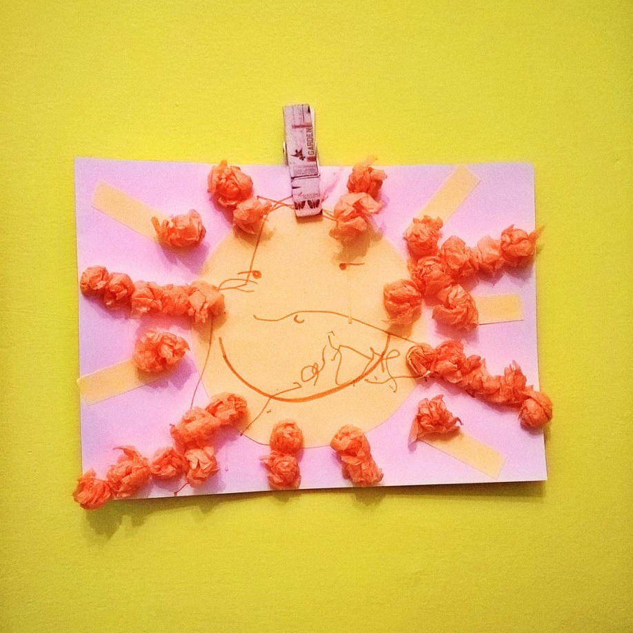 Il sole lo abbiamo realizzato con cartoncino colorato e tante palline di carta velina….io stendevo la striscia di colla, lui incollava le palline sui raggi tracciati!!