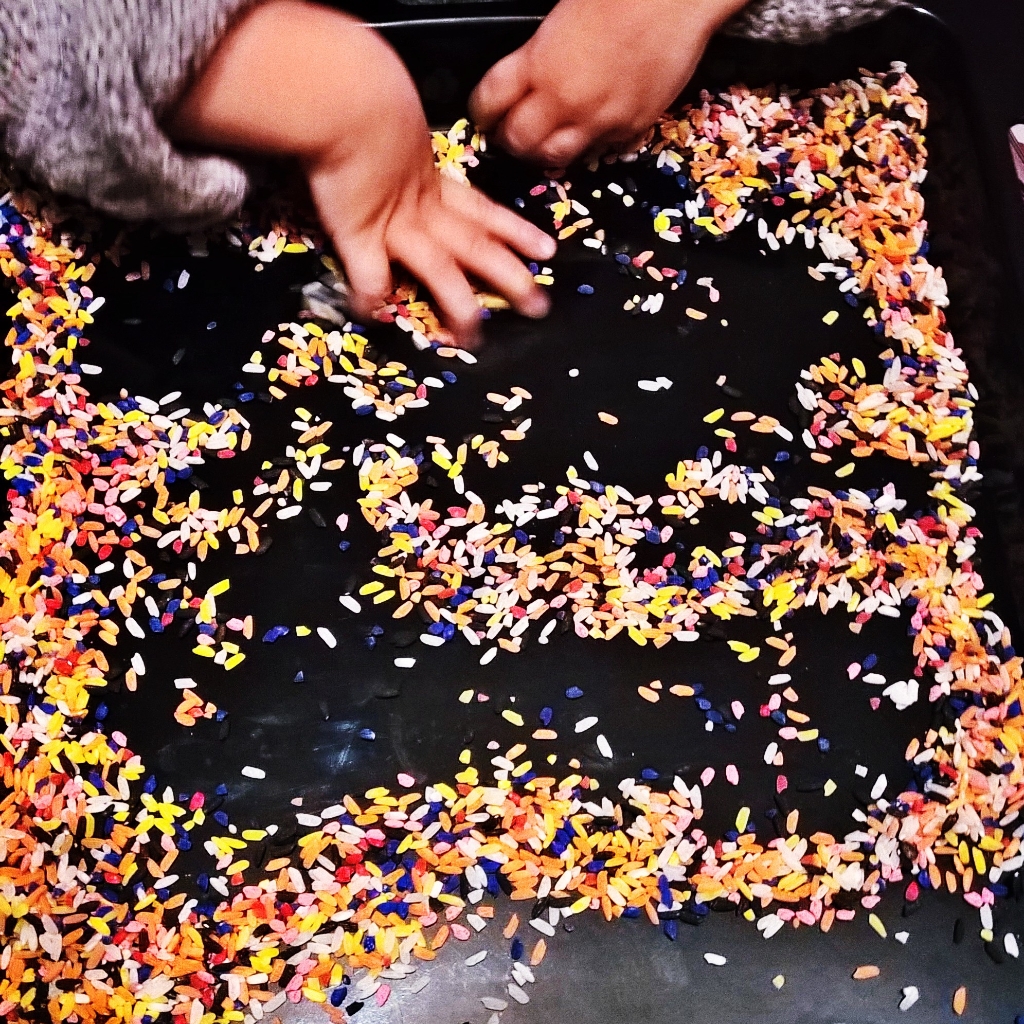 Abbiamo colorato il riso tempo fa con le tempere, colori diversi con cui Piccolo fa di tutto….inizia con i didattici travasi montessoriani, con barattoli e cucchiai di varie grandezze e finisce per lanciarli con più entusiasmo che ad un matrimonio!