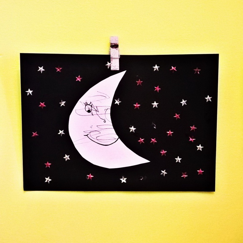 Nel rappresentare la luna invece, Piccolo si è divertito a incollare le stelle, una per una.