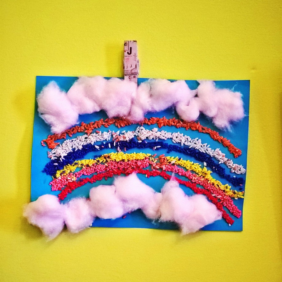 Beh questa volta abbiamo “intrappolato nella la colla” i dispettosi chicchi di riso, per formare un magnifico arcobaleno. Per corredare il cielo abbiamo usato l’ovatta e…non vi dico la meraviglia quando mio figlio ha scoperto questo nuovo materiale.