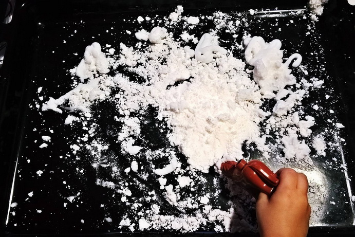 Infine visto che siamo in inverno, in questo periodo dell’anno insieme ai nostri amati pupazzi di neve, entra in casa nostra la neve finta!